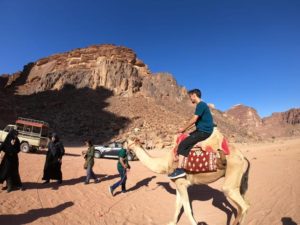 جهزت حقيبتي، و وضعت بها أساسيات الرحلة من ماء، power bank ،الالبسة الثقيلة نسبيا لان الليل في تلك الأماكن يكون باردا و الأكلات الخفيفة فها قد وضعت ما سيلزمني، ثم ذهبت إلى صديقي محمد و كامل، و طرقت بابهما لكي ارى ان كانا قد استعدوا للذهاب، و انتظرتهما حتى اصبحا على أهبة الاستعداد، و ذهبنا إلى باص الرحلة الذي حجزه مديرنا، و مدير المركز الذي ندرس فيه، و ركبنا الباص جميعا من بنات، و شباب، و بدأت الحافلة بالتحرك إلى العقبة و كان الطريق طويلا نسبيا، و لكن التضاريس الطبيعية و المتعة التي قضيناها في الحافلة جعلت الوقت يمر سريعا، و حينما وصلنا العقبة ذهبنا إلى بحر العقبة، و ركبنا قاربا في البحر، و كان هذا القارب مختلف عن اقرانه من القوارب إذ يوجد في وسط القارب مربع من الزجاج بطول و عرض متر من متر عندما تنظر من خلاله ستتمكن من رؤية ما داخل البحر من كائنات بحرية جميلة فكان المنظر خلابا فعلا ،بعد ذلك ذهبنا إلى المسجد لنصلي فصلينا الظهر و العصر جمعا، و من ثم التقطنا بعض الصور في العقبة، ثم خرجنا من العقبة بعد تجوال ممتع متوجهين إلى وادي رم و في طريقنا اشترينا عصير الشمام، و انا حقا أحب طعم الشمام فكنت متشوقا لاجربه كعصير فكان حقا لذيذا كما توقعت فشربنا.،ثم ركبنا الحافلة، و وصلنا إلى القطار العثماني القديم فتذكرنا تاريخنا العريق و شعرت بالفخر و الاعتزاز بأني انتمي إلى بلاد لها هذا التاريخ العظيم، و هذا القطار في منتصف الصحراء، و يمتد من بداية الأردن حتى نهايتها و الآن لا يستخدم لانه قديم جدا لكني سمعت من بعض الناس هناك انهم سيرممونه و يصلحونه لاستخدامه من جديد و بأن الدولة الأردنية تجتهد للقيام بذلك ، و بعد بضع ساعات وصلنا إلى وادي رم ماذا سأخبركم عن هذا المكان الساحر وادي رم هو واحد من أجمل الصحارى الموجودة في العالم كله، والذي يستطيع الإنسان من خلاله الجلوس فيه و الاستمتاع بالمناظر الطبيعية الخلابة الساحرة، التي أبدعها الله تعالى – عز وجل – و يسمى ايضا بوادي القمر حقا لا أعلم كيف أصف هذه الصحراء الذهبية ذات الرمال المتراقصة بالوان الطيف، و كيف أصف غروب الشمس هناك حقا قد ابدع الخالق فيما خلق عندما وصلنا ركبنا سيارة خاصة للصحراء، و ذهبنا إلى منطقة تواجد الجمال، و ركبنا الجمال انها حقا تجربة جميلة و من ثم مشينا على الرمال حفاة بلا أحذية قرابة الساعة، بعدها رجعنا، و ركبنا السيارات للذهاب إلى تلك الهضبة التى سنرى من فوقها غروب الشمس الذي اخبرتكم عنه سابقا انه فعلا مميز و جميل اسهبنا بوصفنا لكن هذا المكان حقا يستحق ما يوصف به، ثم ركبنا مرة اخرى السيارات، و ذهبنا إلى خيامنا الموجودة في وسط الصحراء هذا المكان المنقطع عن العالم بدون أي خدمة للاتصالات لمدة يوم لا مع قريب و لا مع حبيب بعد ذلك